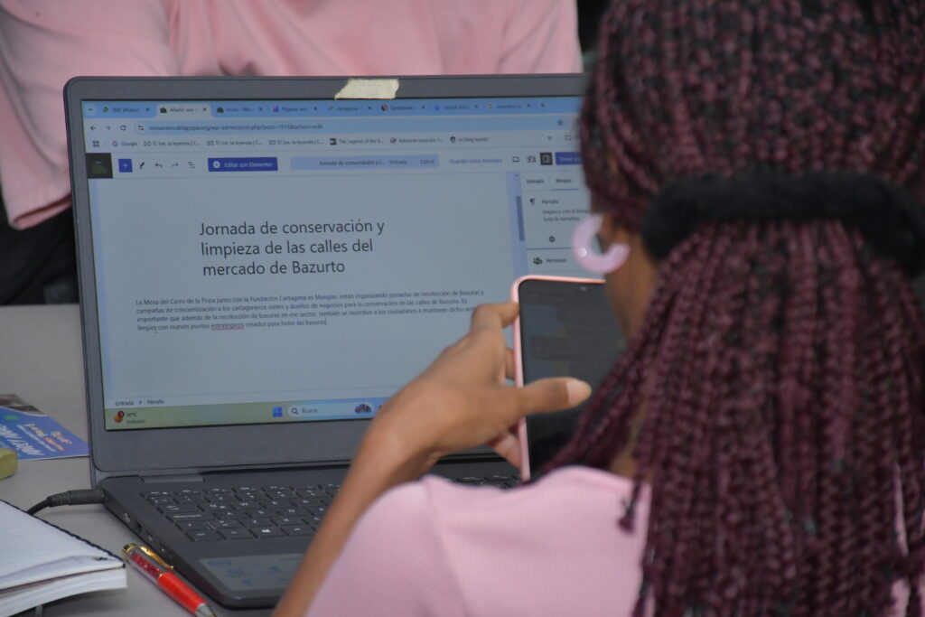 En el segundo momento, los participantes trabajaron en el manejo práctico de la página web de la Mesa por la Defensa Territorial del Cerro de La Popa. Aprendieron sobre su estructura, la redacción de contenidos optimizados para SEO y la publicación de información relevante. Se generaron contenidos enfocados en visibilizar las problemáticas ambientales de Cartagena y las acciones realizadas por las organizaciones para proteger los ecosistemas urbanos.